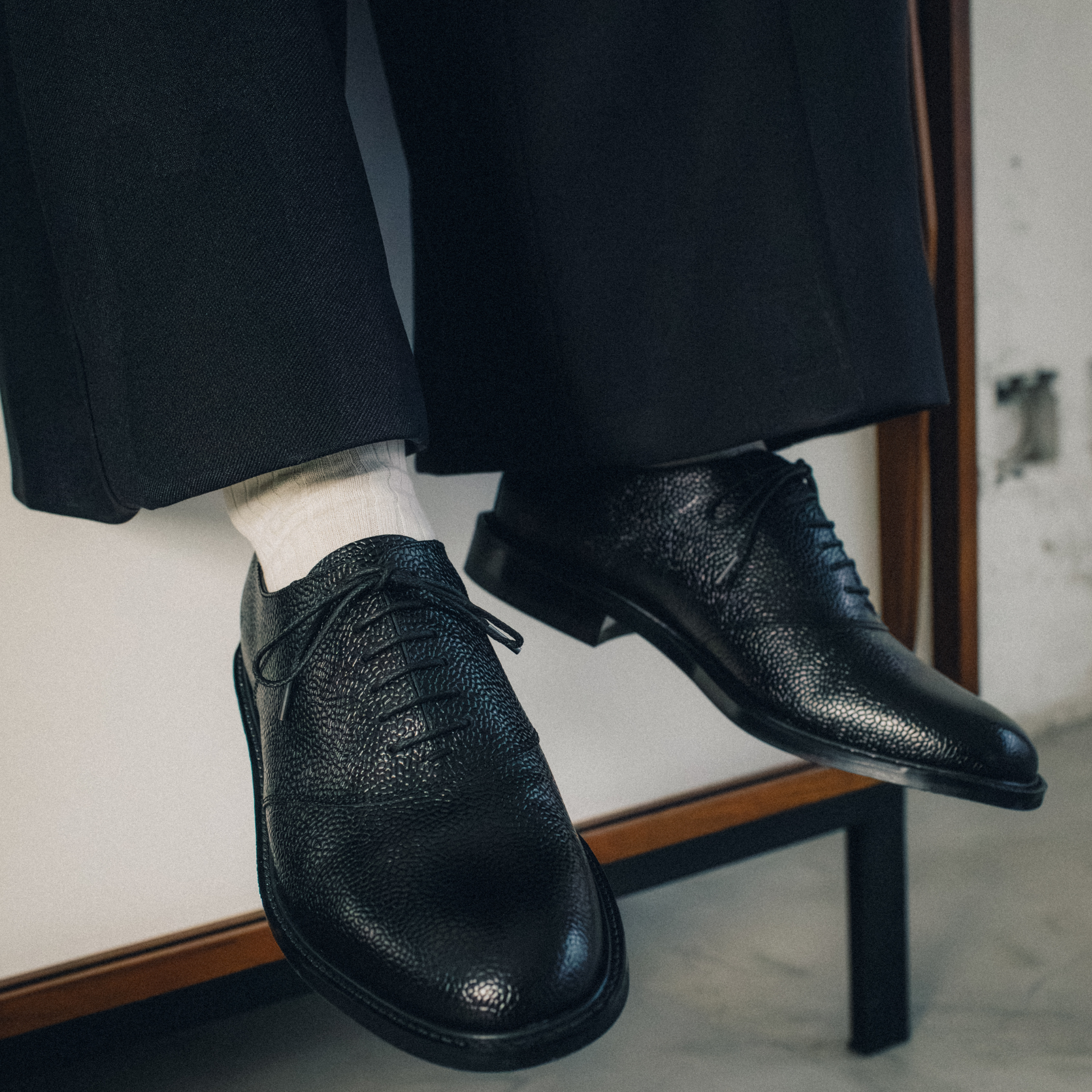 ブランドが誕生した1986年の1stコレクションにラインアップされていたアーカイブを活用し、ローファー同様に既存の日本製革靴にはない要素を加え発信をするヒモ靴の第一弾。踵下と土踏まずをサポートするクッションインソールを採用し、履き始めからストレスを感じにくい、日常使いに最適なスペックを備えています。キズが目立ちにくくタフな印象を醸すシボ柄の型押しレザーを大胆に全面に配した、渋い一足です。サドルシューズは、靴の中央部分に「馬の鞍(サドル)」のような形をした別の革が縫い付けられているデザインのことを言います。ゴルフ、ボーリング、テニスなどのスポーツで広く履かれた歴史のあるカジュアルなレザーシューズに、< The Kenford Fineshoes >らしい要素を加え発信します。