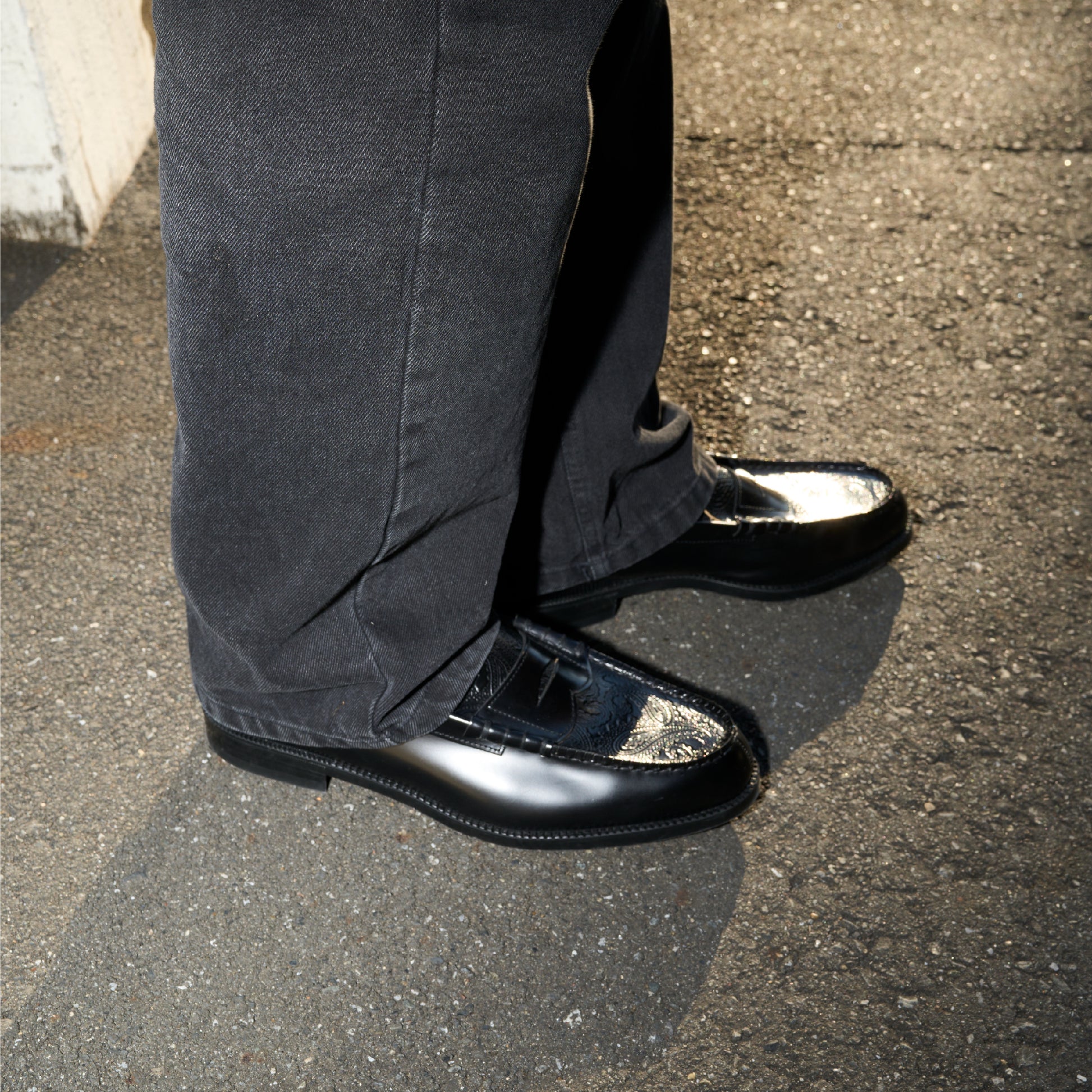 ブラックローファーの新定番を目指し、プレス加工を施したレザーをアッパーに使用したエンボスローファー。”ペイズリー柄”を大胆に使用したアッパーは、クラシックローファーの雰囲気とフィットし、足元に大きなインパクトをもたらす1足です。汎用性を高める為、中央・サイド・バックにスムースレザーを使用したデザインを追加しました。