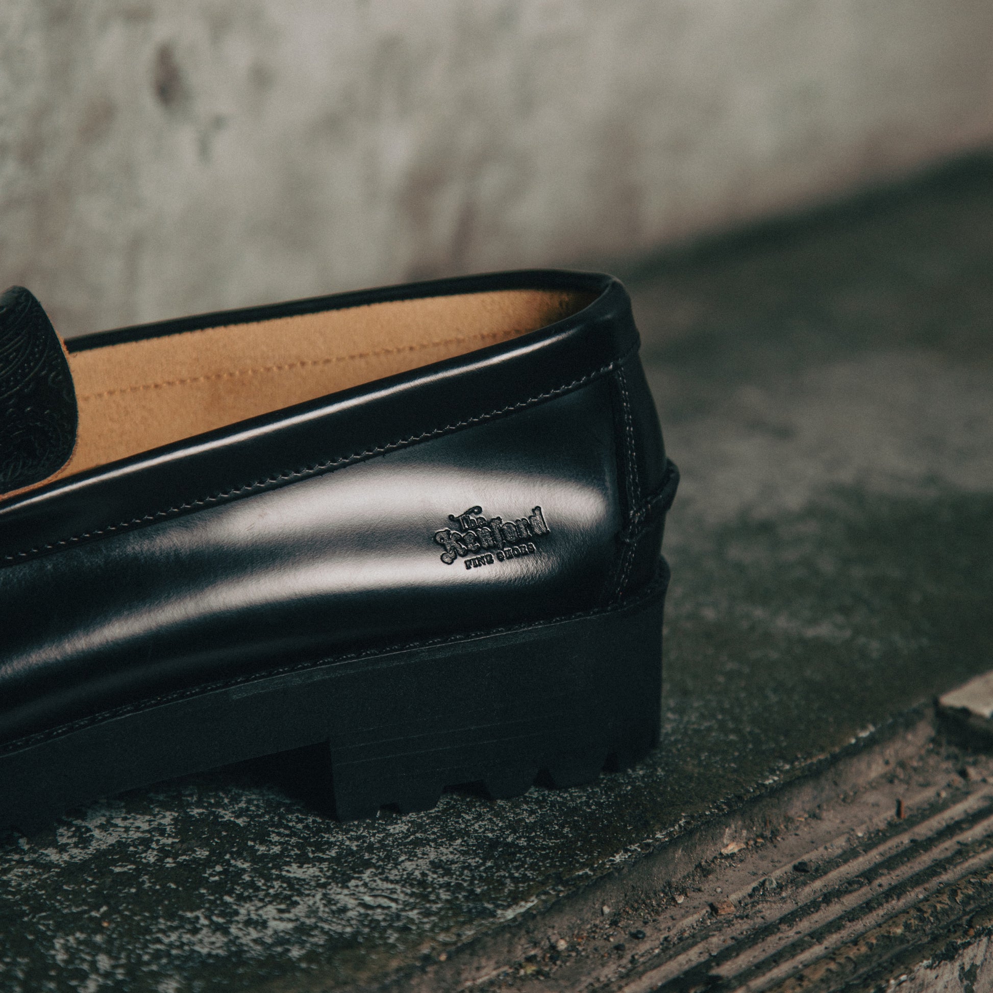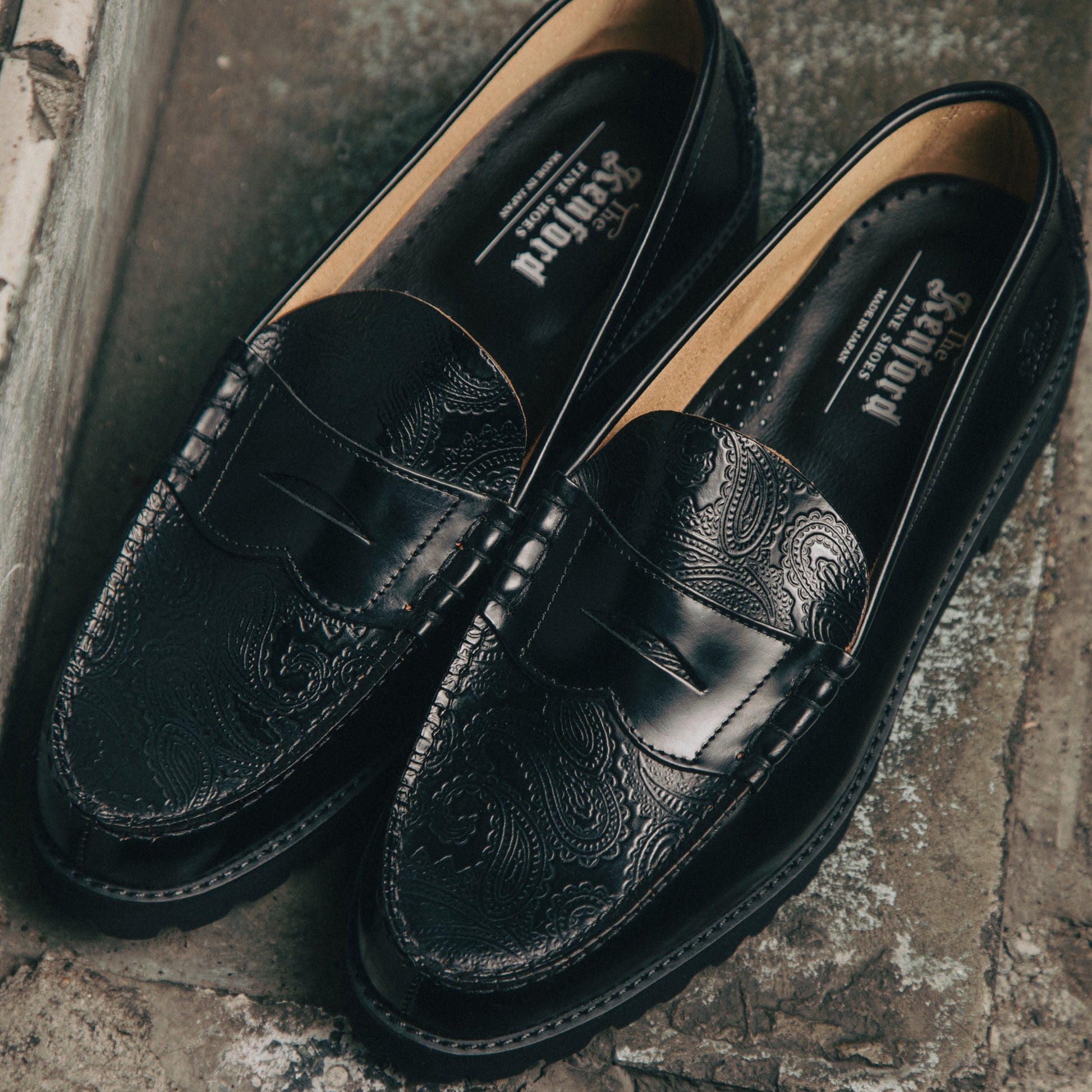 より履き心地を高める為に、3cm程度の厚みがあるタンクソールを搭載したレザーローファー。クッション性が向上し、長時間履いていても疲れにくい仕様を目指しました。アウトソールはスニーカーにも使用されるEVA素材で出来ている為、ボリュームがありながらも軽さも併せ持ちます。ルーズでボリュームのあるボトムスにも負けない、ブーツのような感覚で履ける1足です。”ペイズリー柄”を大胆に使用したアッパーは、クラシックローファーの雰囲気とフィットし、足元に大きなインパクトをもたらす1足です。汎用性を高める為、中央・サイド・バックにスムースレザーを使用したデザインを追加しました。