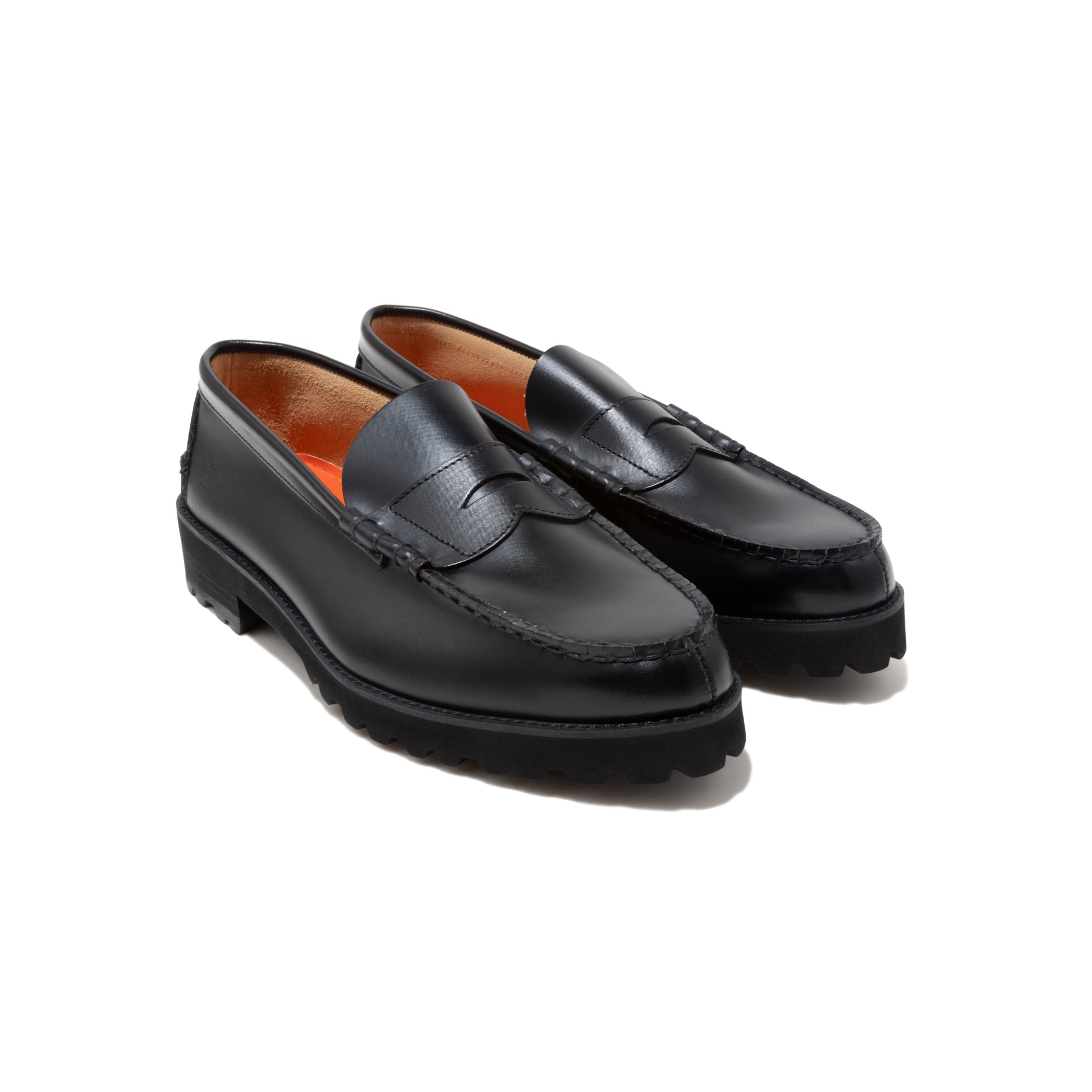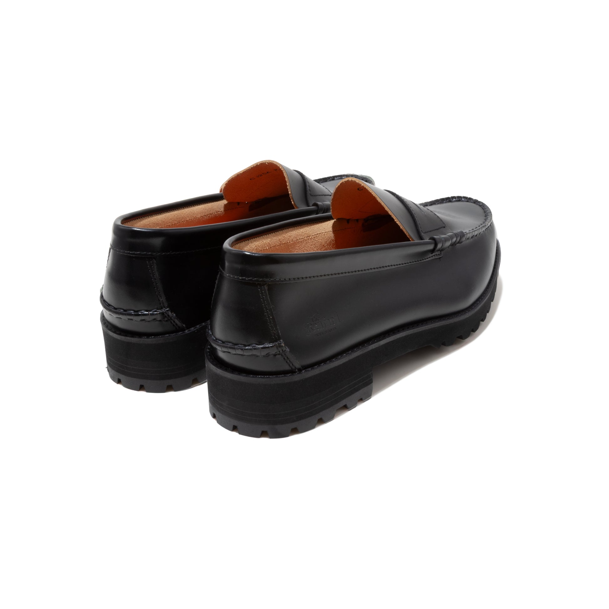 This product is a reimagining of The Kenford Fineshoes' classic "Tank Sole Loafers," developed to dispel the image of leather shoes as being stiff and heavy, and is an AVIREX classic. The upper is made of black leather embossed with the heavyweight nylon used in the MA-1, and the insole is the same orange as the MA-1. The thick tank sole matches the volume of the upper, and is light and cushioned, achieving specifications that make it perfect for casual wear.