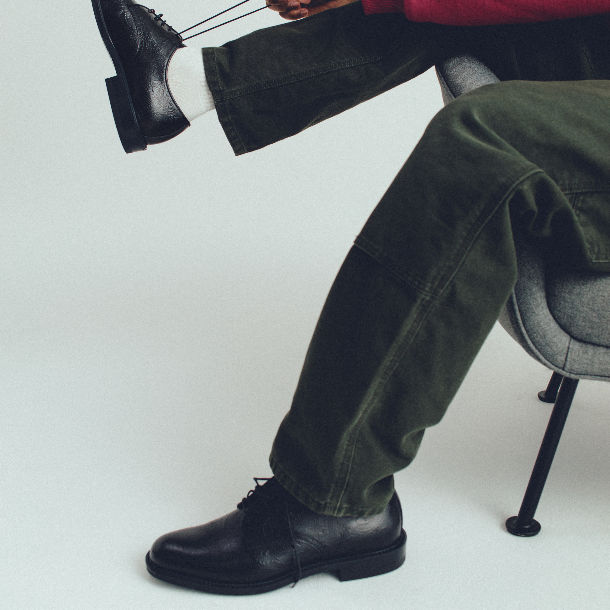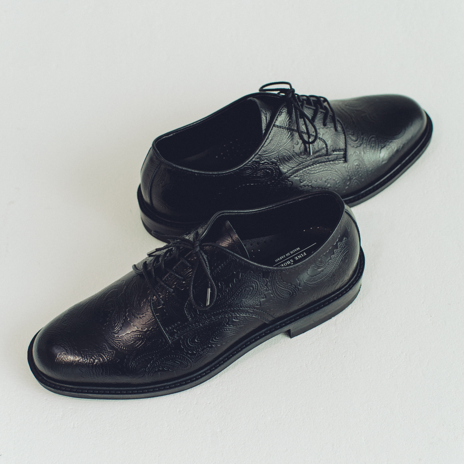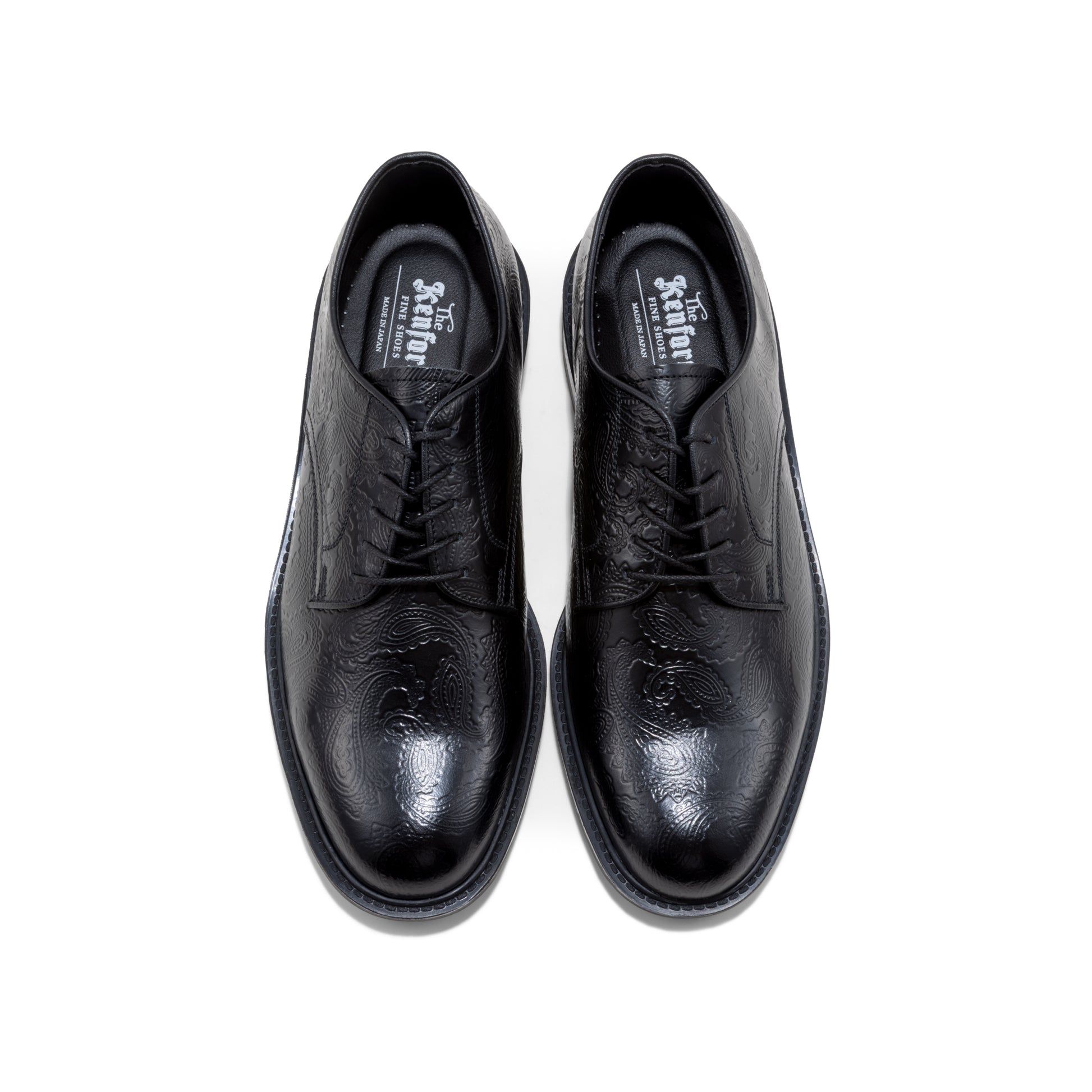 ブランドが誕生した1986年の1stコレクションにラインアップされていたアーカイブを活用し、ローファー同様に既存の日本製革靴にはない要素を加え発信をするヒモ靴の第一弾。ブランドの象徴であるペイズリー柄の型押しレザーを大胆に全面に配した、インパクトのある一足です。踵下と土踏まずをサポートするクッションインソールを採用し、履き始めからストレスを感じにくい、日常使いに最適なスペックを備えています。プレーントウは、つま先部分に装飾が一切ない、最もシンプルでベーシックなデザインの靴のこと。シンプルだからこそ、最も汎用性が高く、使いやすいと言われているレザーシューズに、< The Kenford Fineshoes >らしい要素を加え発信します。