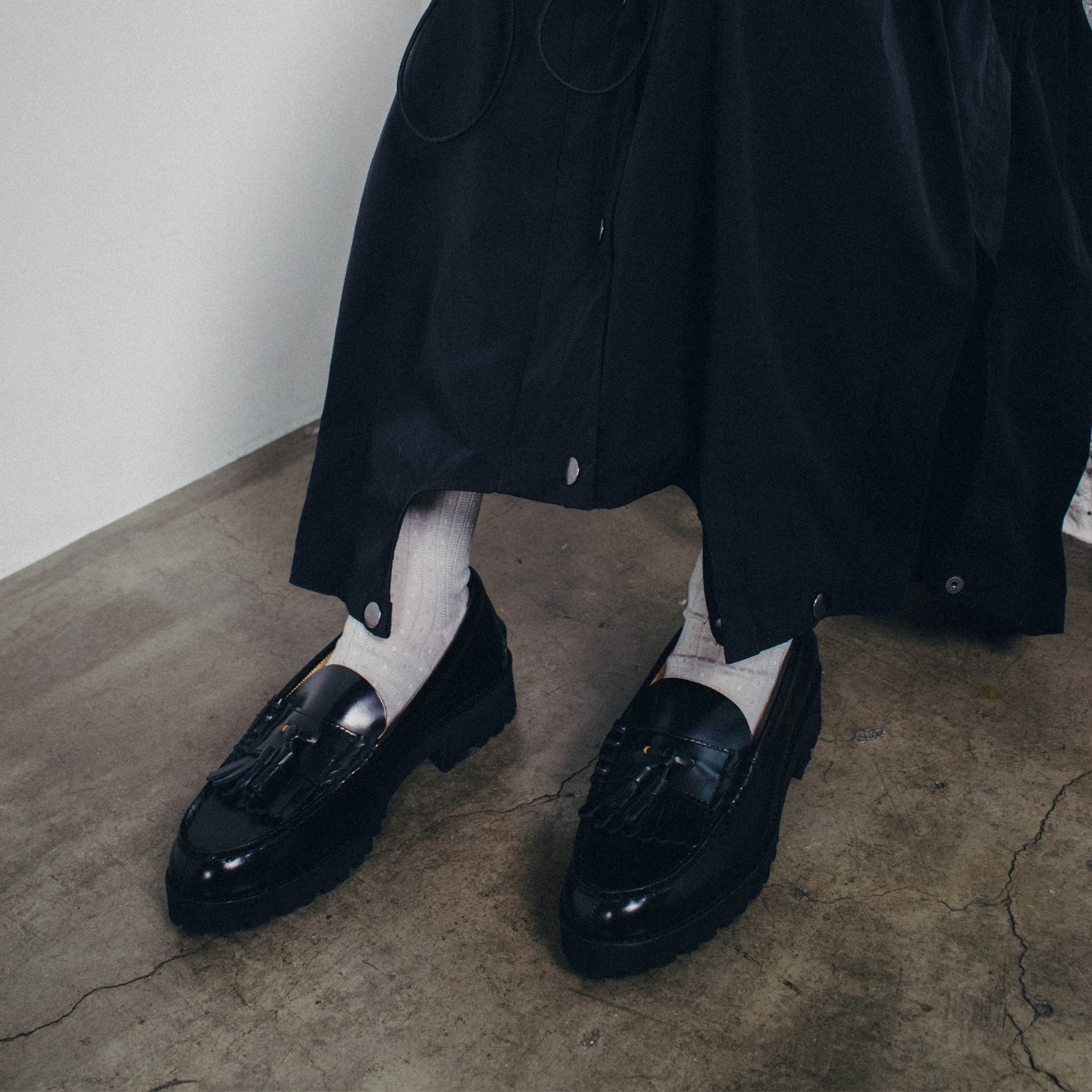 より履き心地を高める為に、3cm程度の厚みがあるタンクソールを搭載したレザーローファー。クッション性が向上し、長時間履いていても疲れにくい仕様を目指しました。スニーカーにも使用されるEVA素材のアウトソールは、軽さも併せ持ち、使いやすい1足。ルーズでボリュームのあるボトムスにも負けない、ブーツのような感覚で履ける1足です。