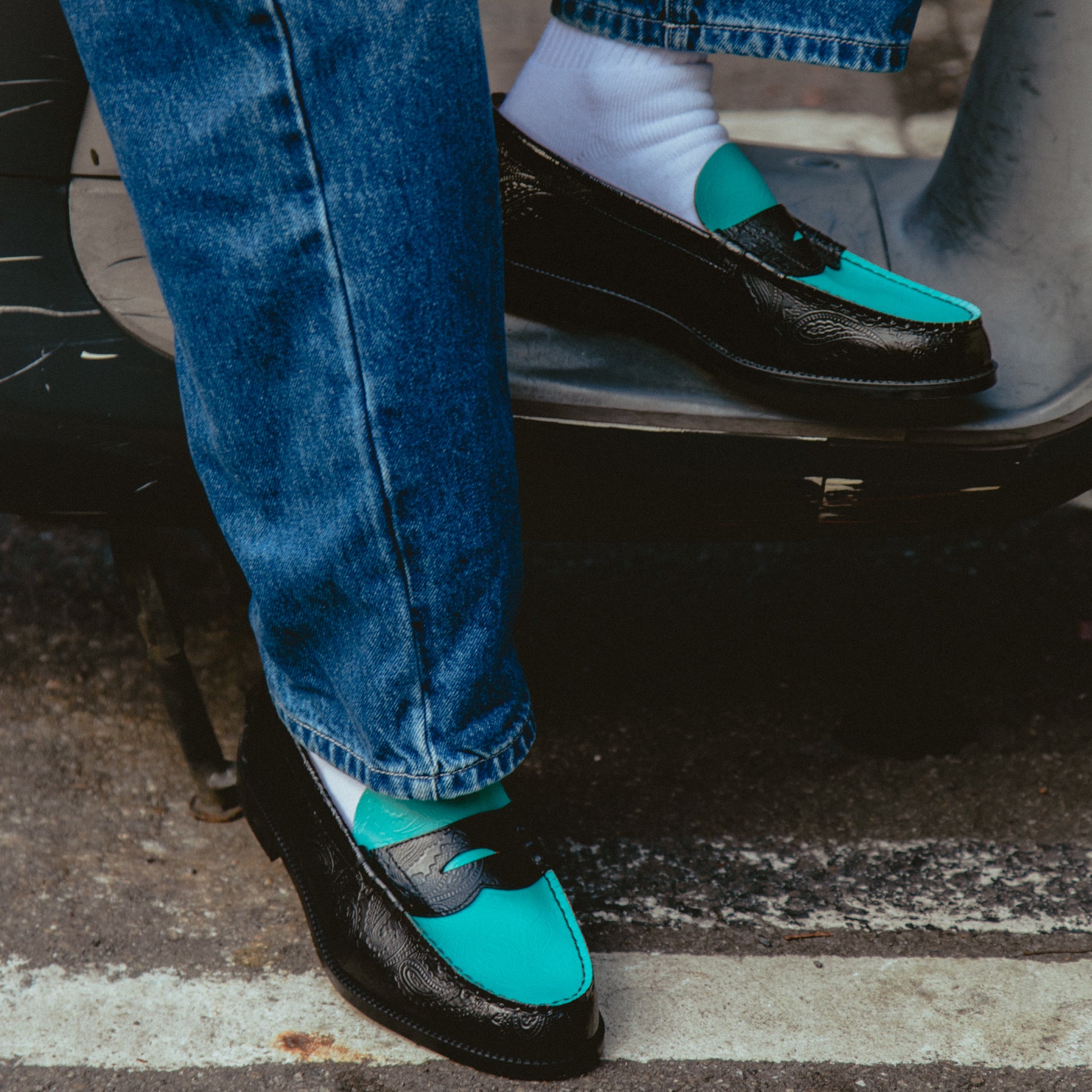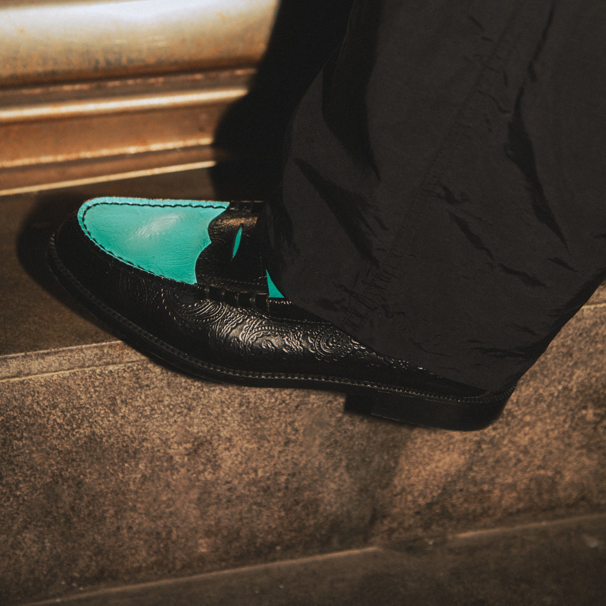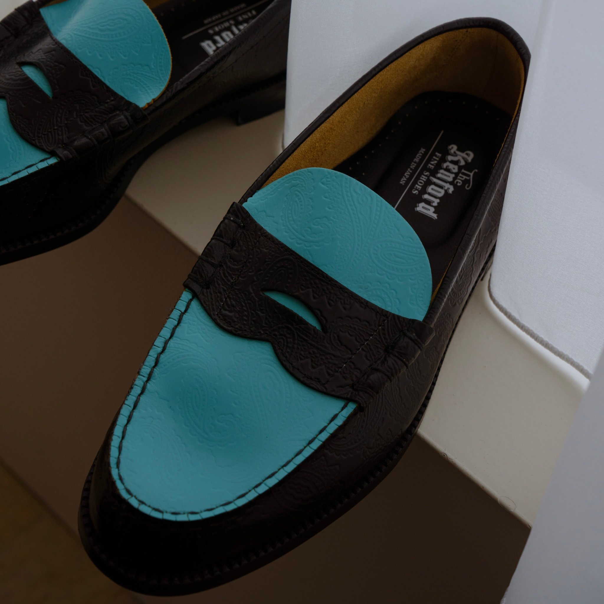 ブランドの顔であるペイズリー柄に、鮮やかなターコイズブルーを掛け合わせた特別な一足。