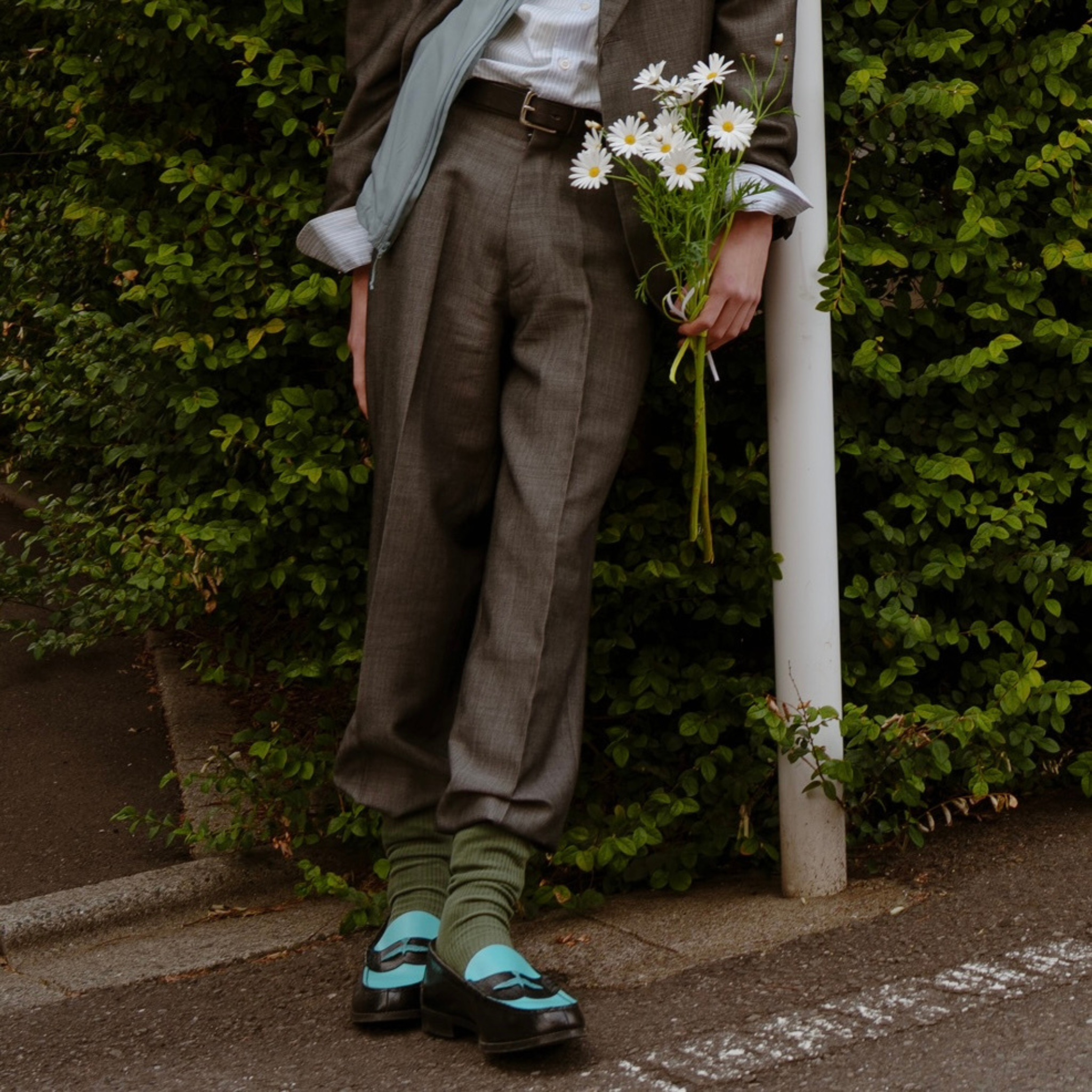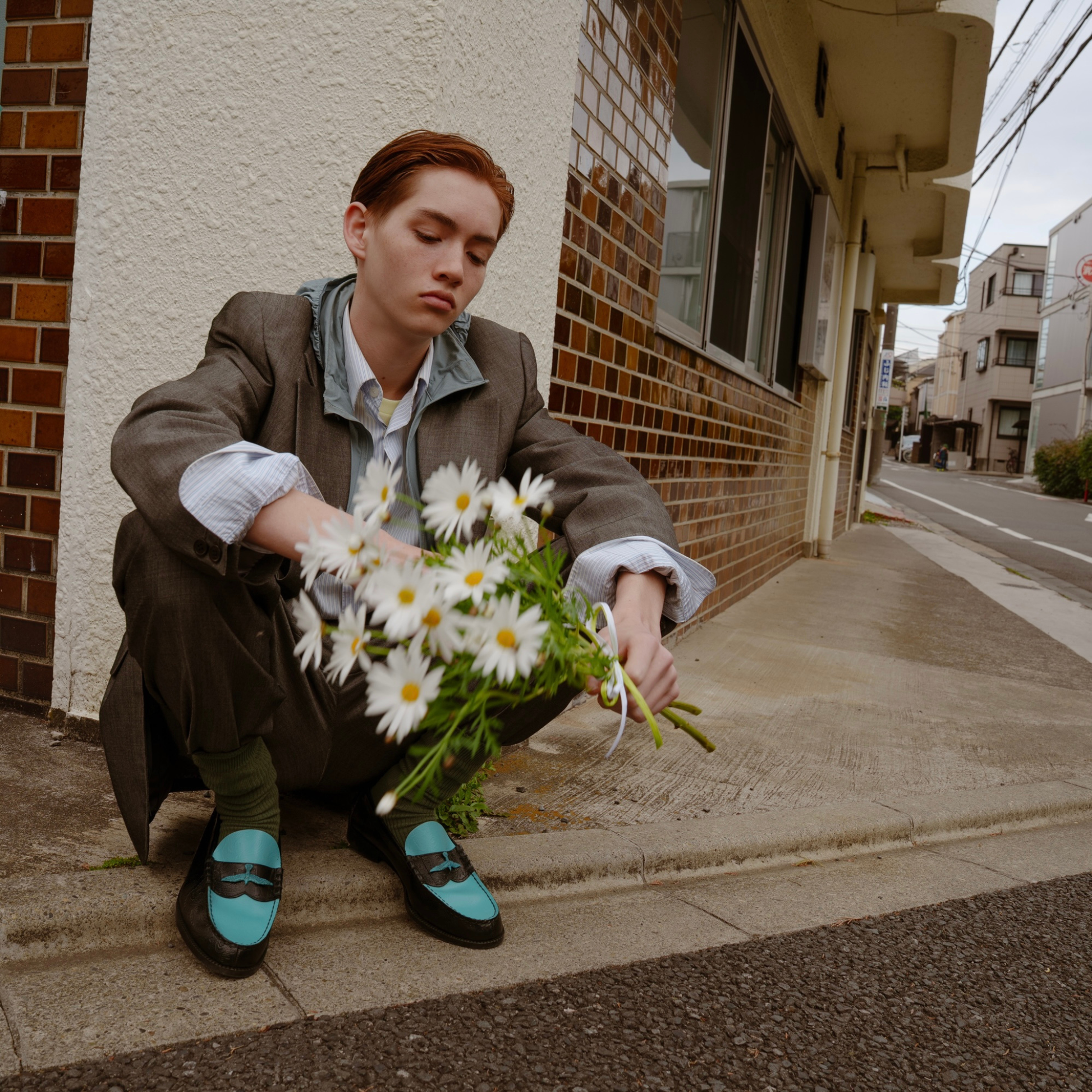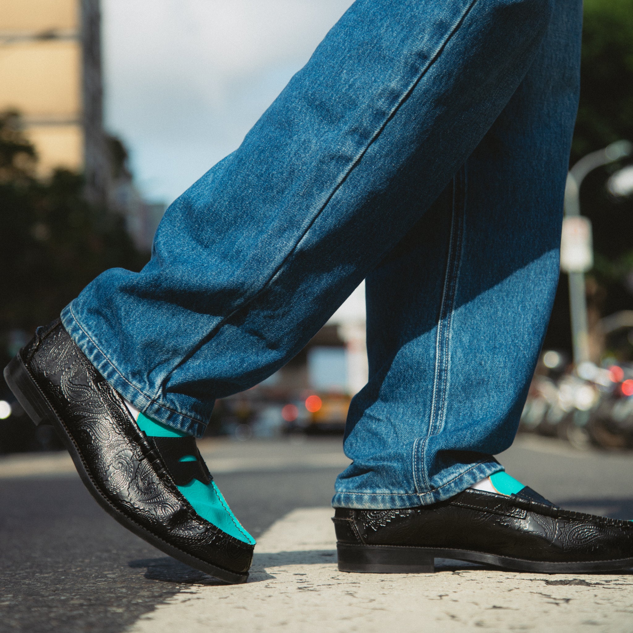 ブランドの顔であるペイズリー柄に、鮮やかなターコイズブルーを掛け合わせた特別な一足。