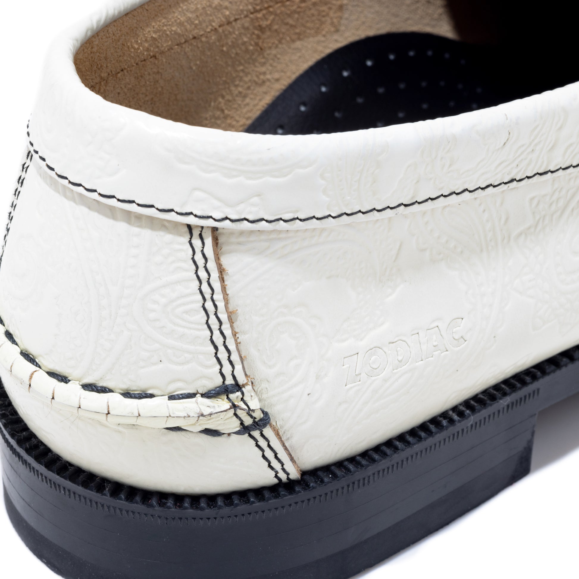 ペイズリー柄とツートーンローファーの定番カラーリングであるブラックホワイトを組み合わせ、さらなるインパクトをもたらす為に、反転した配色にて仕立てました。ヒール外側には特別にZODIACロゴを刻印しています。