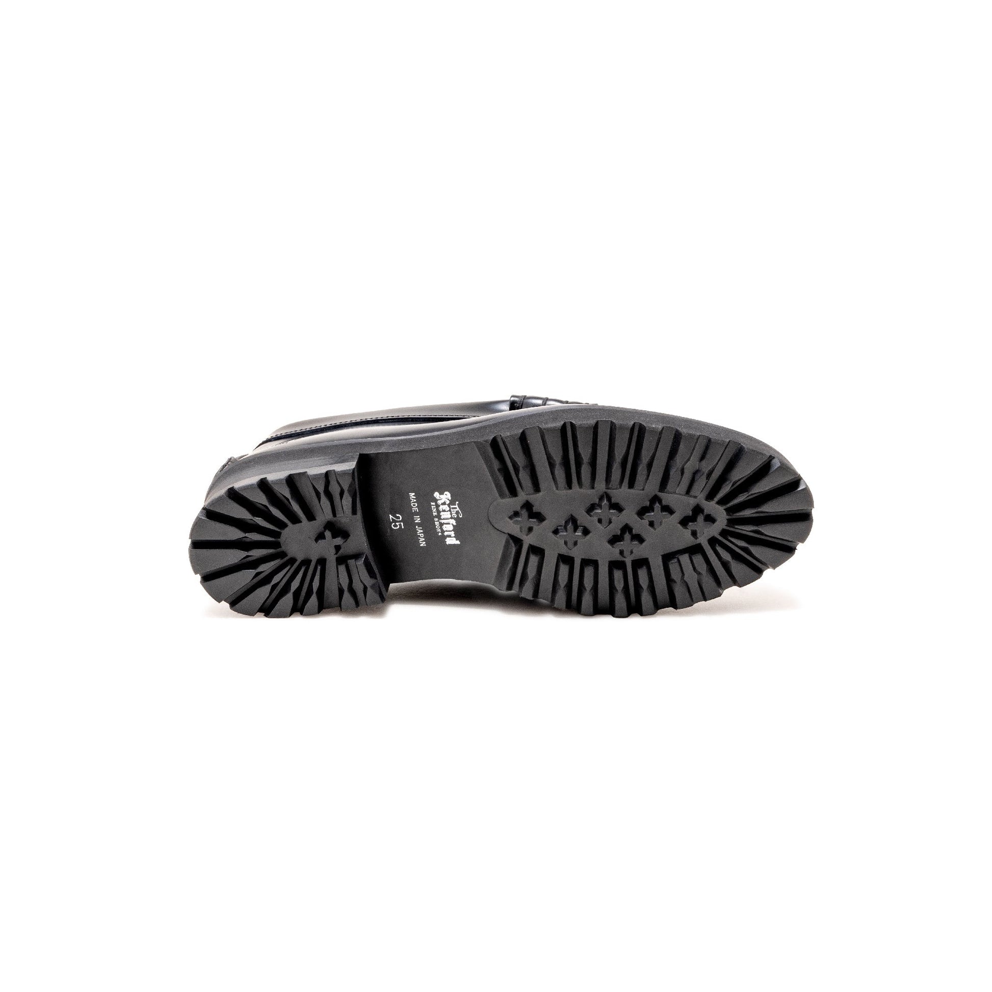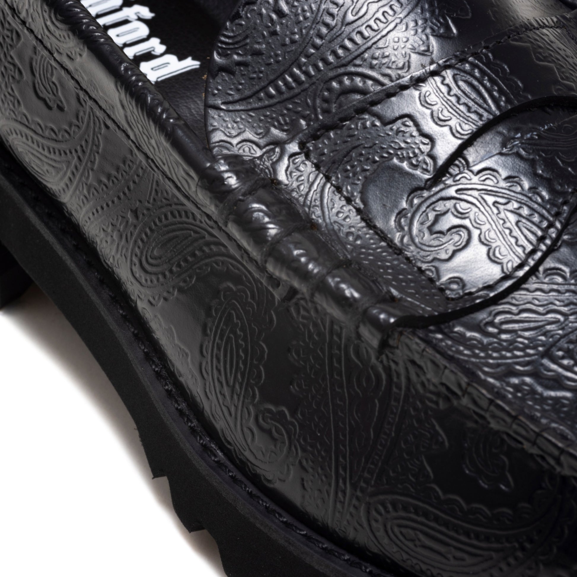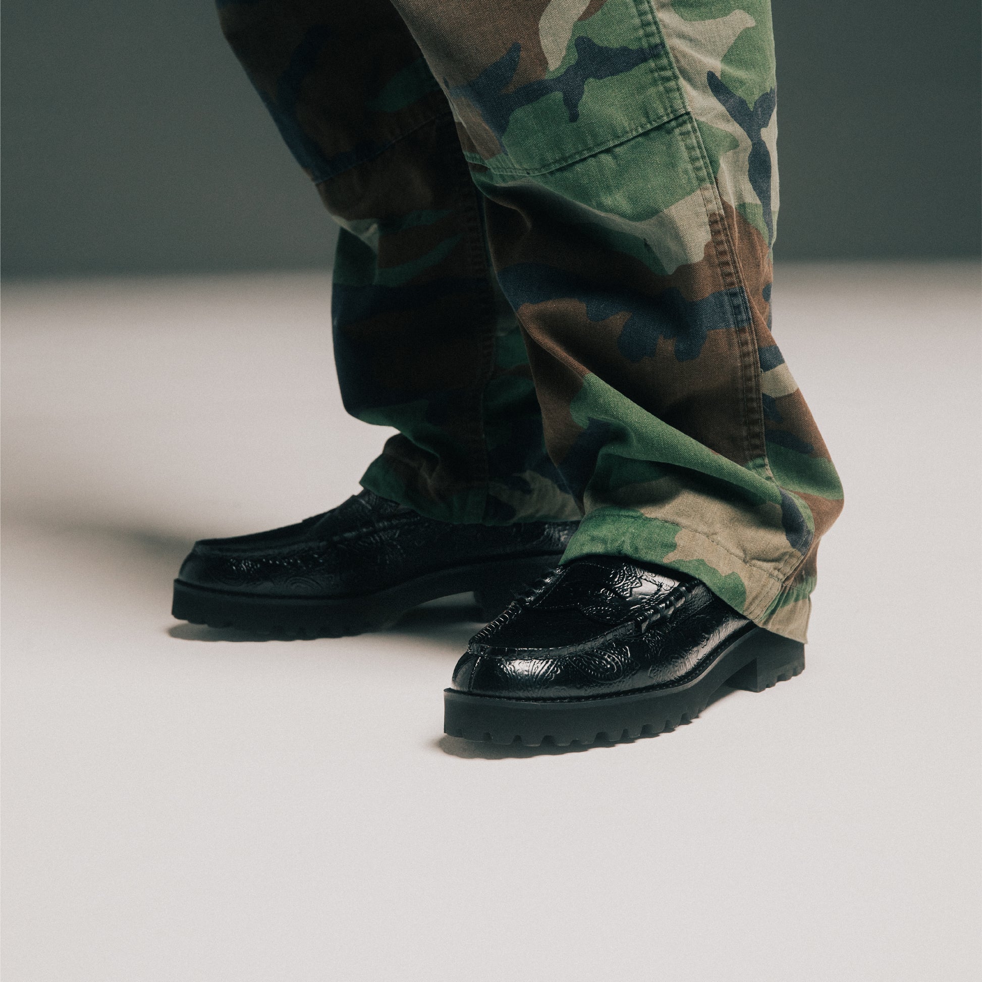 より履き心地を高める為に、3cm程度の厚みがあるタンクソールを搭載したレザーローファー。クッション性が向上し、長時間履いていても疲れにくい仕様を目指しました。アウトソールはスニーカーにも使用されるEVA素材で出来ている為、ボリュームがありながらも軽さも併せ持ちます。ルーズでボリュームのあるボトムスにも負けない、ブーツのような感覚で履ける1足です。”ペイズリー柄”を大胆に使用したアッパーは、クラシックローファーの雰囲気とフィットし、足元に大きなインパクトをもたらす1足です。