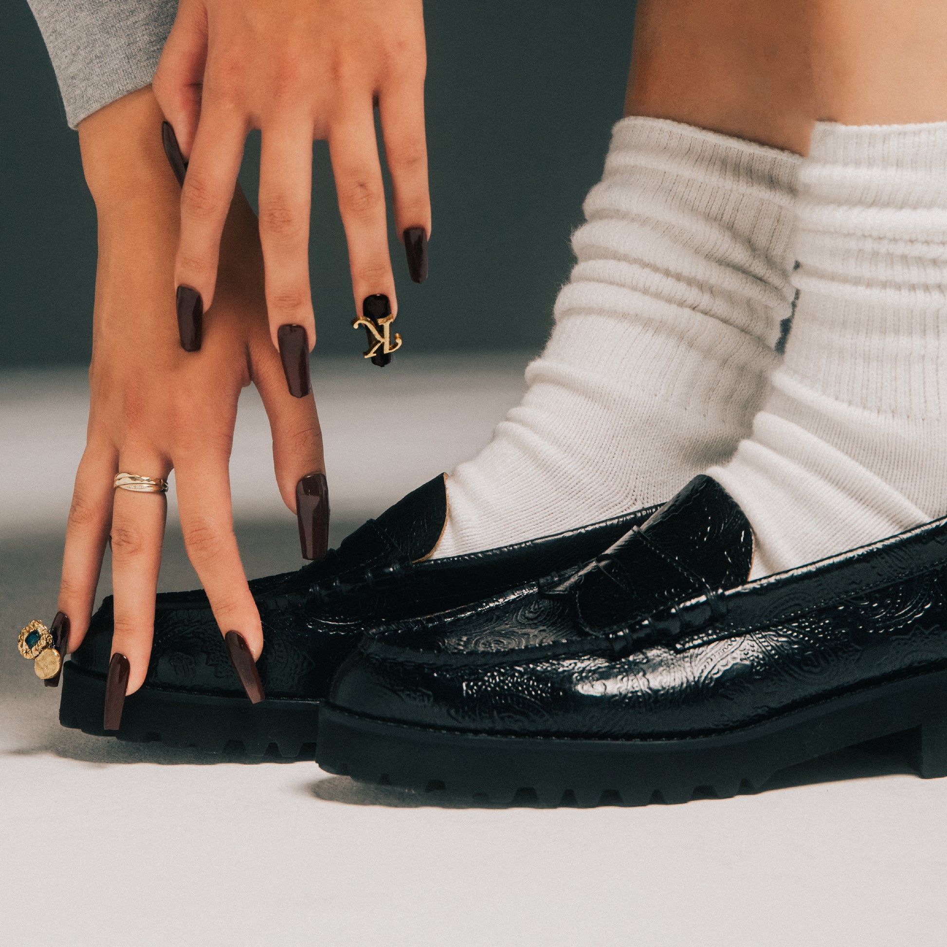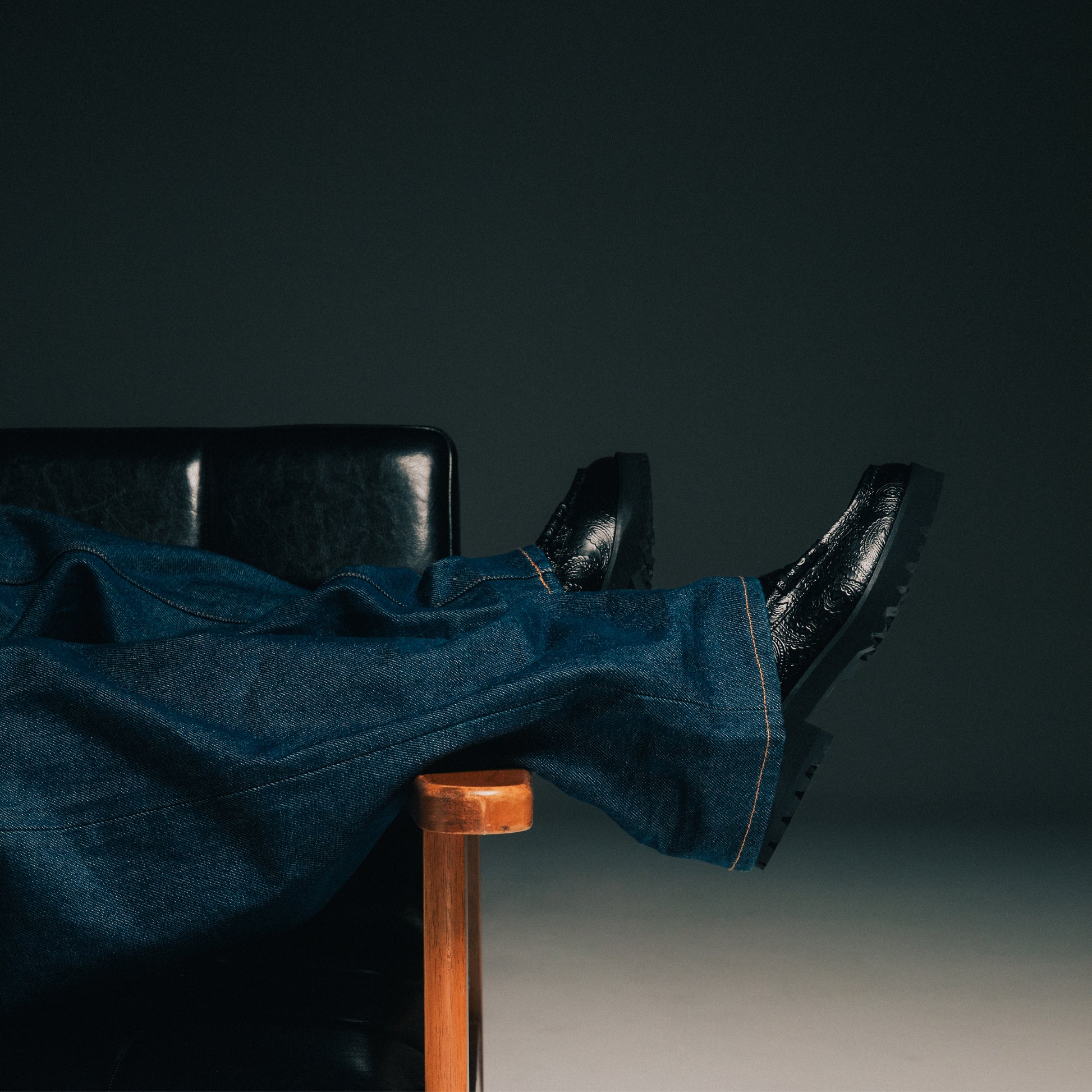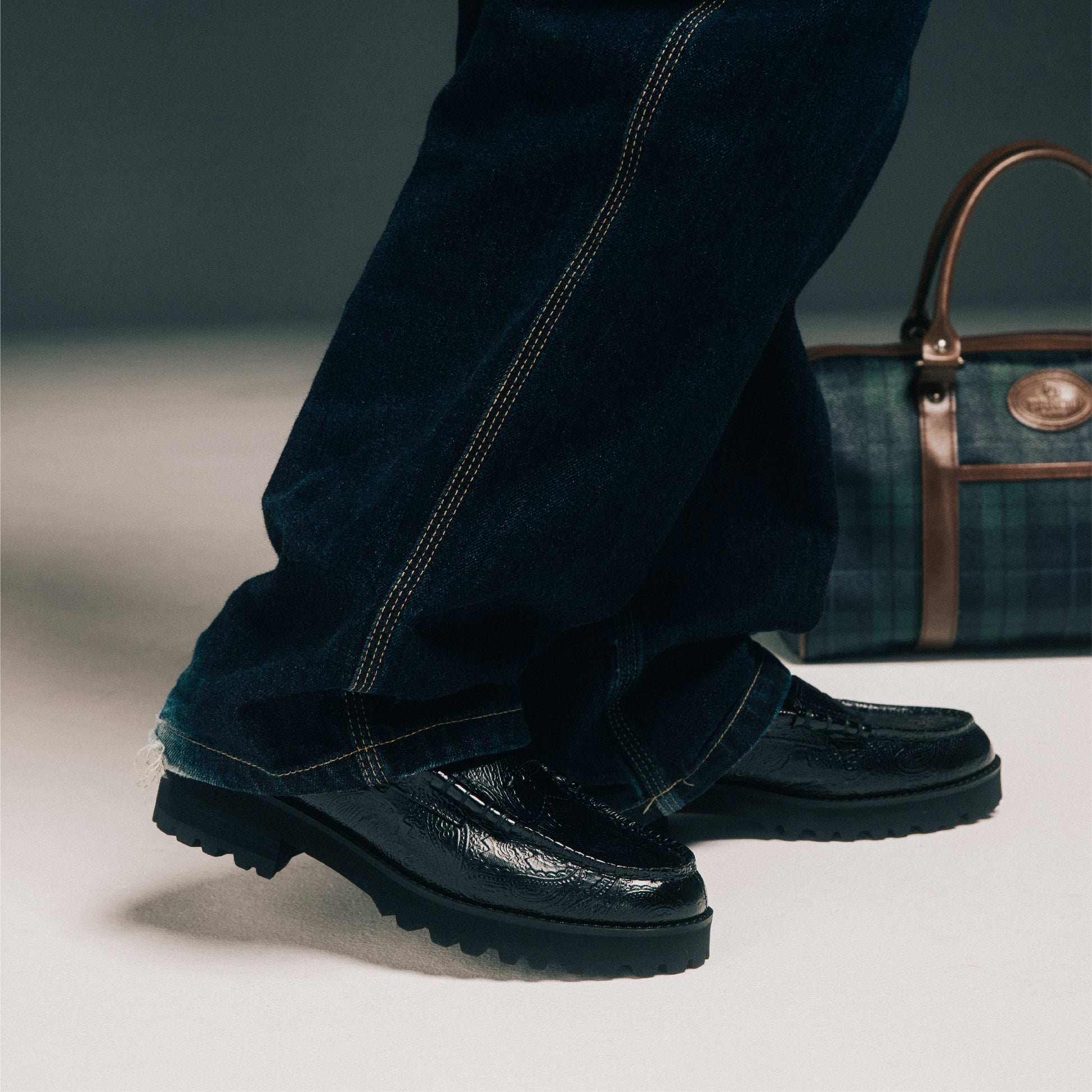 より履き心地を高める為に、3cm程度の厚みがあるタンクソールを搭載したレザーローファー。クッション性が向上し、長時間履いていても疲れにくい仕様を目指しました。アウトソールはスニーカーにも使用されるEVA素材で出来ている為、ボリュームがありながらも軽さも併せ持ちます。ルーズでボリュームのあるボトムスにも負けない、ブーツのような感覚で履ける1足です。”ペイズリー柄”を大胆に使用したアッパーは、クラシックローファーの雰囲気とフィットし、足元に大きなインパクトをもたらす1足です。