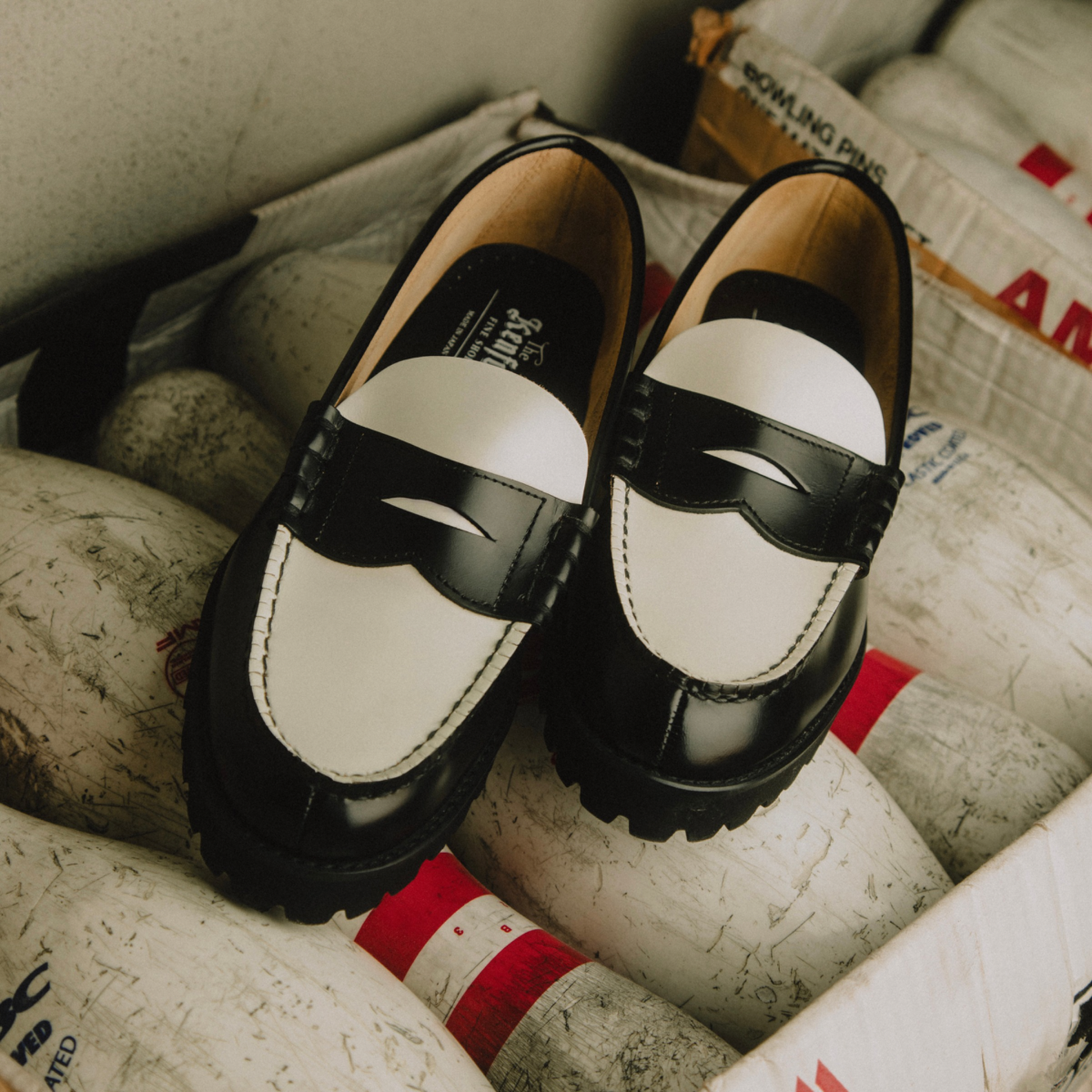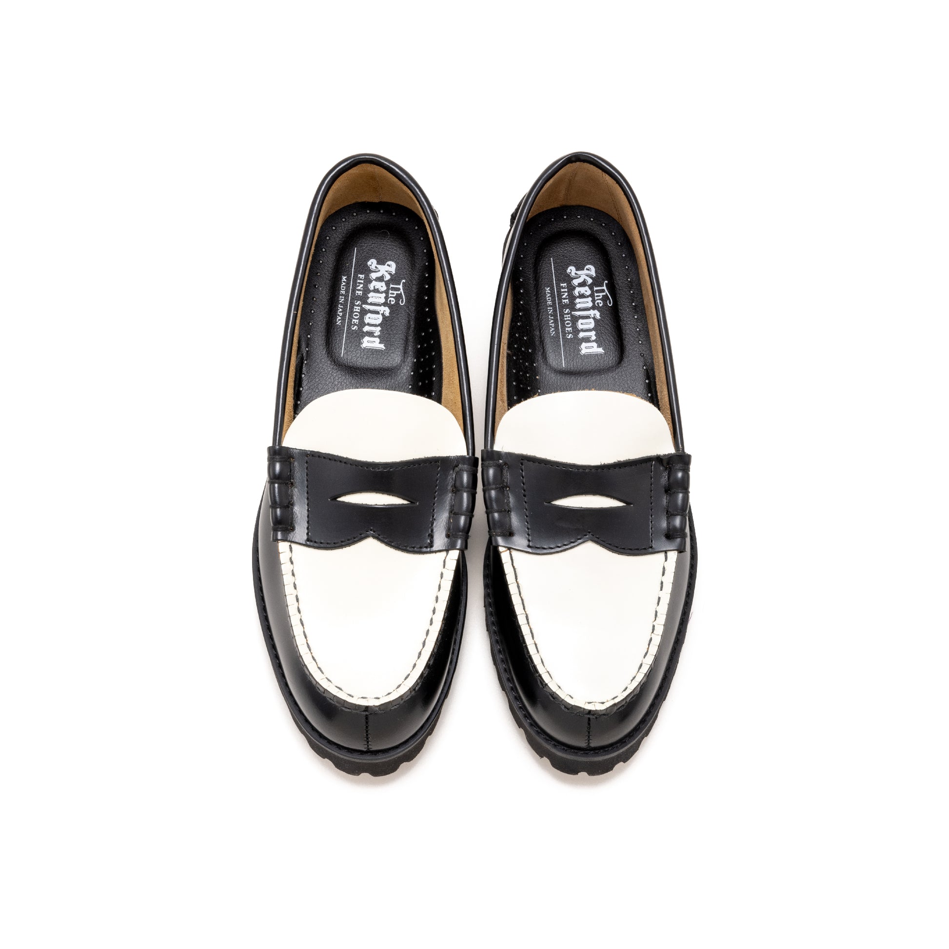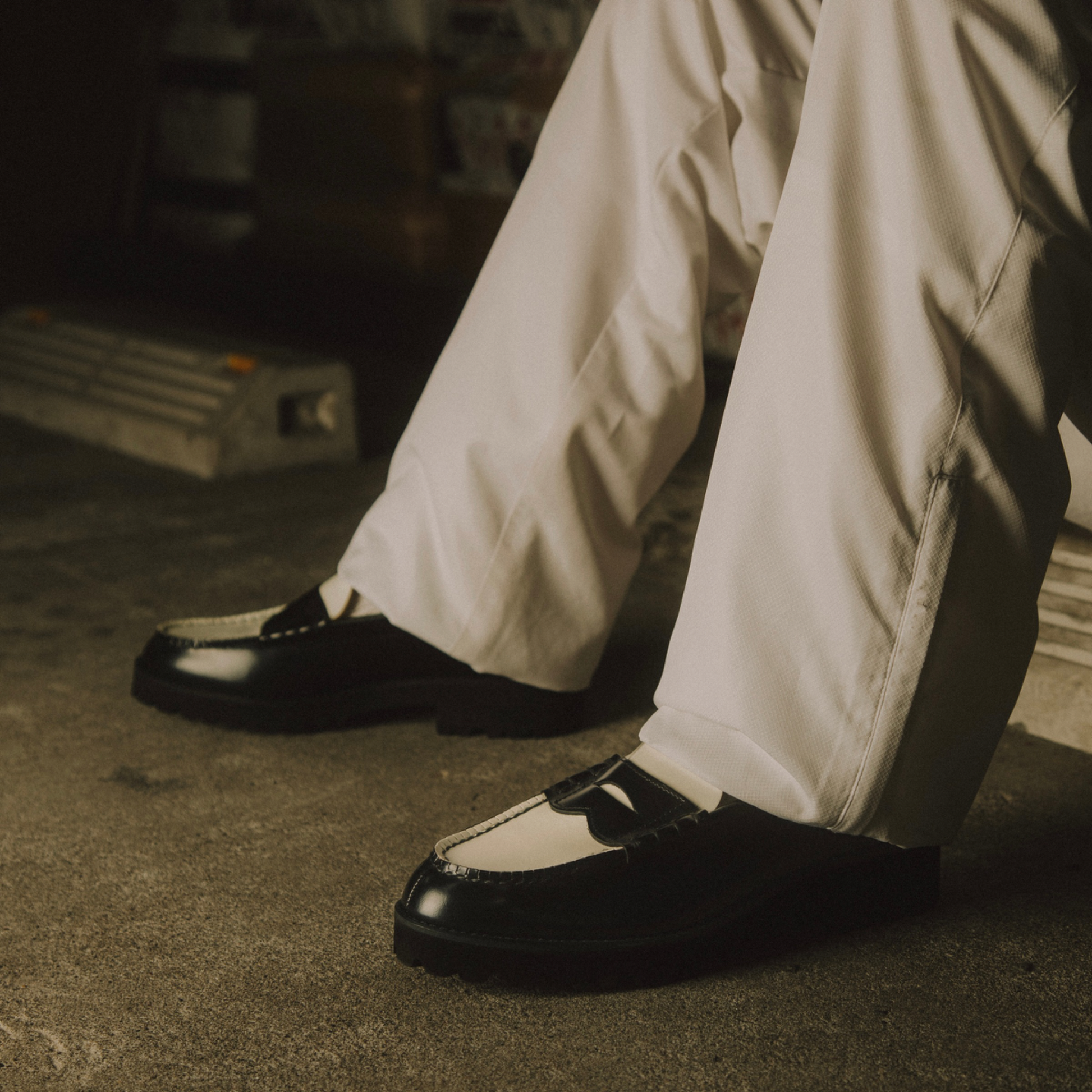 より履き心地を高める為に、3cm程度の厚みがあるタンクソールを搭載したレザーローファー。クッション性が向上し、長時間履いていても疲れにくい仕様を目指しました。アウトソールはスニーカーにも使用されるEVA素材で出来ている為、ボリュームがありながらも軽さも併せ持ちます。ルーズでボリュームのあるボトムスにも負けない、ブーツのような感覚で履ける1足です。定番のブラック×ホワイトの配色を追加しました。
